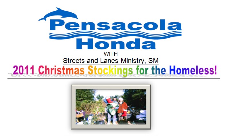 During the 2010 Christmas season we gave out Christmas Stockings to the Homeless. In support with Streets & Lanes Ministry, Pensacola Honda was represented by delivering over 200 stockings! This year we would like to extend the invitation to each of you to participate in this rewarding experience.